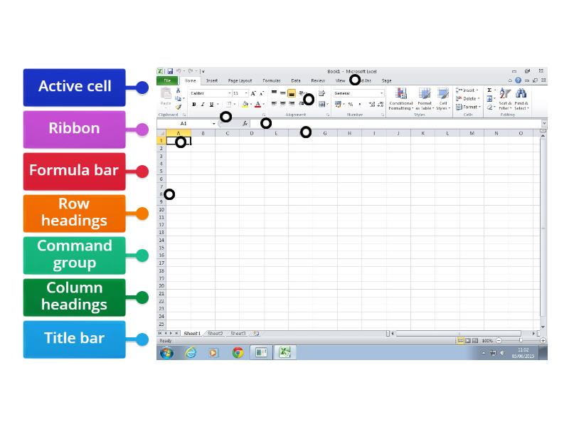 Title bar, Formula bar, Row headings, Column headings, Ribbon, Active cell, Command group.