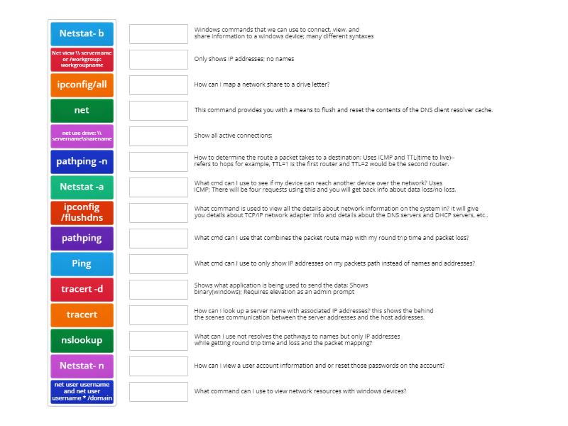 Ping - What cmd can I use to see if my device can reach another device over the network?  Uses ICMP; There will be four requests using this and you will get back info about data loss/no loss. , Netstat -a - Show all active connections; , Netstat- b - Shows what application is being used to send the data; Shows binary(windows); Requires elevation as an admin prompt, Netstat- n - Only shows IP addresses; no names, ipconfig/all - What command is used to view all the details about network information on the system in? It will give you details about TCP/IP network adapter info and details about the DNS servers and DHCP servers, etc.. , nslookup -  How can I look up a server name with associated IP addresses? this shows the behind the scenes communication between the server addresses and the host addresses.  , net - Windows commands that we can use to connect, view, and share information to a windows device; many different syntaxes, Net view \\ servername or /workgroup: workgroupname - What command can I use to view network resources with windows devices? , net use drive: \\ servername\sharename - How can I map a network share to a drive letter? , net user username and net user username * /domain - How can I view a user account information and or reset those passwords on the account?, tracert - How to determine the route a packet takes to a destination; Uses ICMP and TTL(time to live)-- refers to hops for example, TTL=1 is the first router and TTL=2 would be the second router. , tracert -d - What cmd can I use to only show IP addresses on my packets path instead of names and addresses? , pathping - What cmd can I use that combines the packet route map with my round trip time and packet loss?, pathping -n - What can I use not resolves the pathways to names but only IP addresses while getting round trip time and loss and the packet mapping?, ipconfig /flushdns - This command provides you with a means to flush and reset the contents of the DNS client resolver cache.,