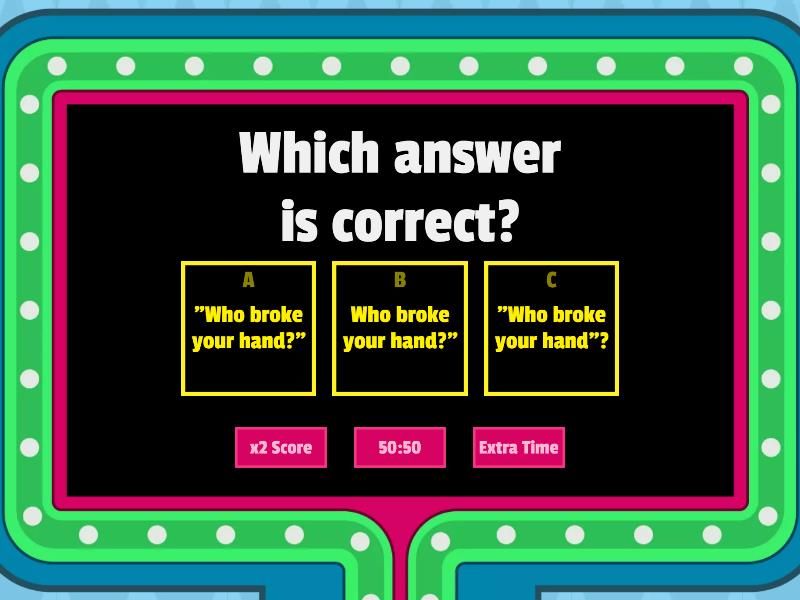 1) Which answer is correct? a) "Who broke your hand?" b) Who broke your hand?" c) "Who broke your hand"? 2) Which symbol tells us somebody has started speaking? a) ! b) . c) " d) ? 3) You've made my floor dirty said Larry. Which part of this sentence should be in speech marks? a) "You've made my floor dirty" b) "You've made my floor dirty said Larry" c) You've made my floor dirty "said Larry" 4) Which sentence is perfect? a) "I love my new bike" said the boy. b) "i love my new bike," said the boy. c) "I love my new bike," said the boy. 5) Which symbol tells us somebody has finished speaking? a) ' b) " c) ; d) : 6) Speech Marks tell us... a) we've come to the end of a sentence b) that someone is speaking c) that a question has been asked d) we need to take a pause 7) Speech marks are sometimes called a) Talky things b) Quotation marks and Inverted commas c) 66 and 99 d) Speaking apostrophes 8) What is the best way to punctuate this speech: "What is your problem_" a) ? b) . c) ! d) , 9) Which sentence shows the inverted commas in the correct place? a) Have you seen my “dog?” she asked. b) “Have you seen my dog? she asked.” c) Have you seen “my dog?” she asked. d) “Have you seen my dog?” she asked.