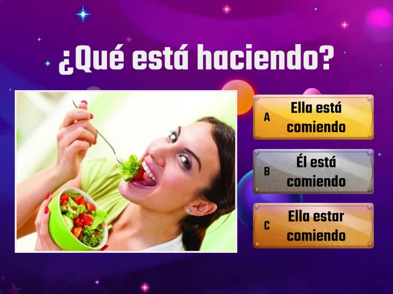 1) ¿Qué está haciendo? a) Ella está comiendo b) Él está comiendo c) Ella estar comiendo 2) ¿Qué están haciendo? a) Ella está caminando b) Ellos estar corriendo c) Ellos están corriendo 3) ¿Qué está haciendo? a) Él está conduciendo b) Ella estar conduciendo c) Él está conducir 4) ¿Qué está haciendo? a) Él está beber b) Él está bebiendo c) Él bebiendo 5) ¿Qué está haciendo? a) El bebé está durmiendo b) El bebe dormir c) El bebé estar durmiendo 6) ¿Qué están haciendo? a) Ellos estar hablando b) Ellos hablar c) Ellos están hablando 7) ¿Qué está haciendo? a) Está escribiendo b) Estar escribiendo c) Está escribir 8) ¿Qué está haciendo? a) Está pensando b) Estar hablando c) Estamos pensando 9) ¿Qué están haciendo? a) Están jugando al ajedrez b) Estar jugar al ajedrez c) Estamos jugar al ajedrez 10) ¿Qué están haciendo? a) Ella está peinando al bebé b) Ella estar peinando al bebé c) Ella estar peinar al bebé