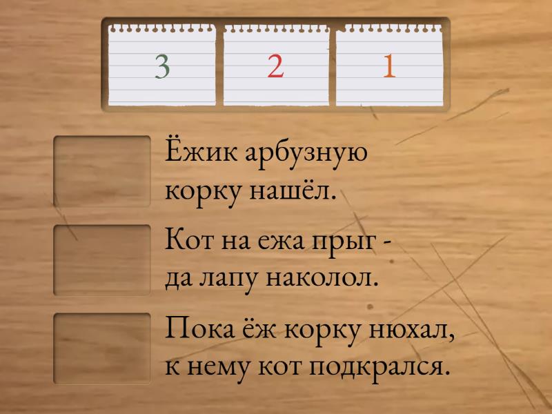 1 - Ёжик арбузную корку нашёл., 2 - Пока ёж корку нюхал, к нему кот подкрался., 3 - Кот на ежа прыг - да лапу наколол.,