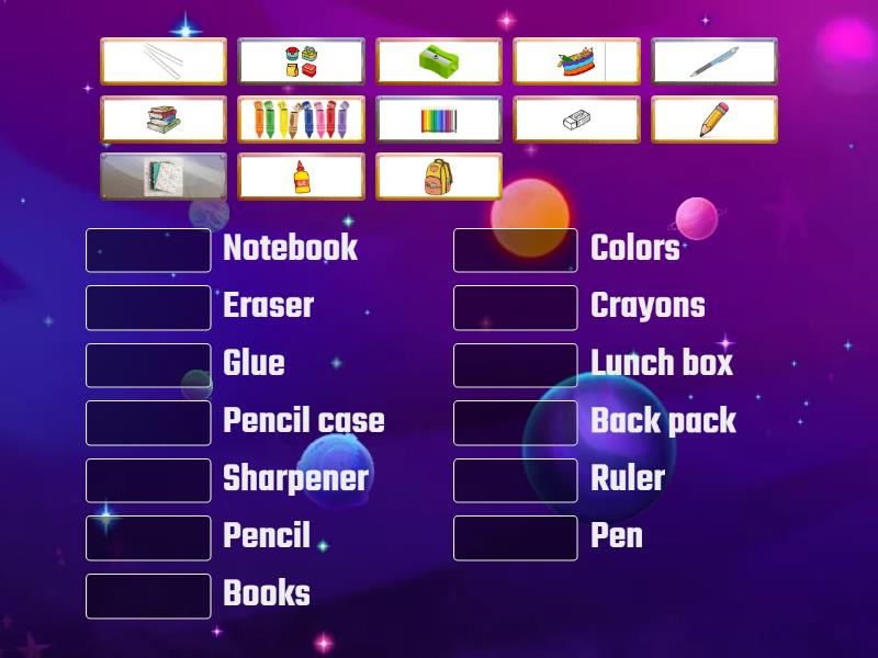 Pencil, Pen, Notebook, Ruler, Eraser, Sharpener, Glue, Lunch box, Back pack, Crayons, Pencil case, Colors, Books,