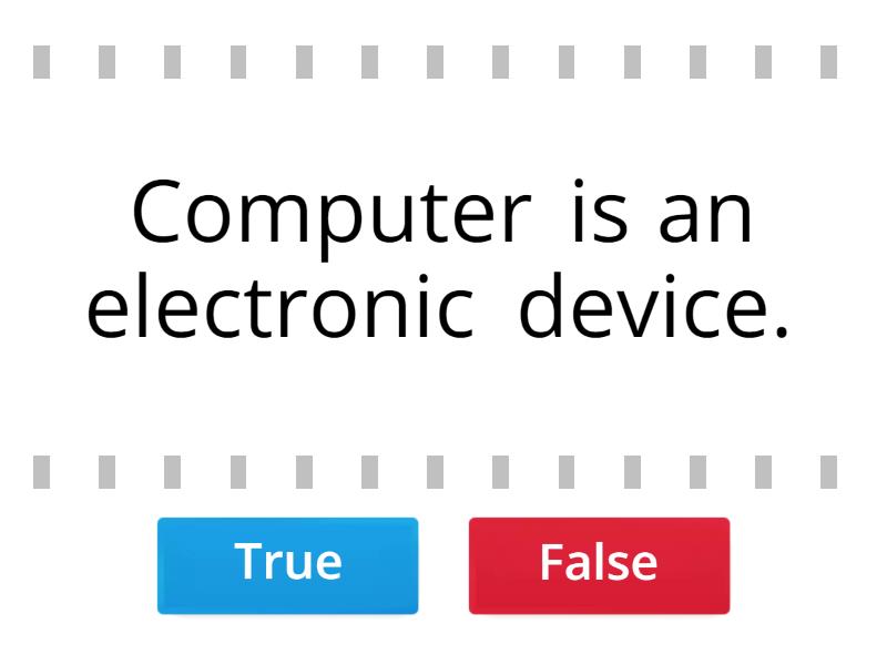 True: Computer is an electronic device., Computer is very fast., Computer is accurate., Computer works on very high speed., Computer stores large volume of data., False: Computer also needs break., Computer understand our feelings., Computer can think., Computer can hear and understand., The computer take long time to give a desired answer.,