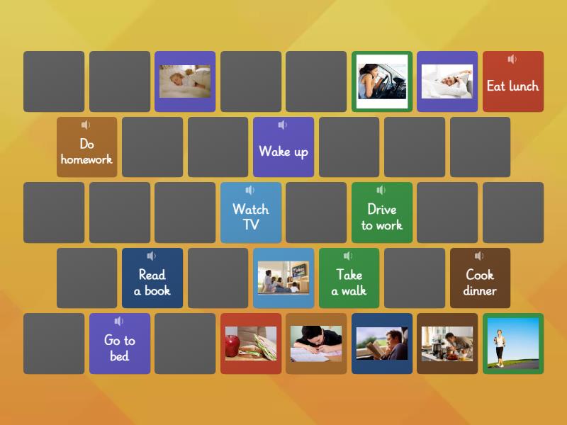 Take a walk, Go to bed, Eat lunch, Watch TV, Cook dinner, Read a book, Do homework, Drive to work, Wake up, Take a shower, Brush your teeth, Get dressed, Exercise, Clean the house, Do the dishes, Surf the internet, Do the laundry, Have breakfast, Relax,