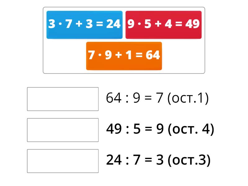 9 · 5 + 4 = 49 - 49 : 5 = 9 (ост. 4), 3 · 7 + 3 = 24 - 24 : 7 = 3 (ост.3), 7 · 9 + 1 = 64 - 64 : 9 = 7 (ост.1),