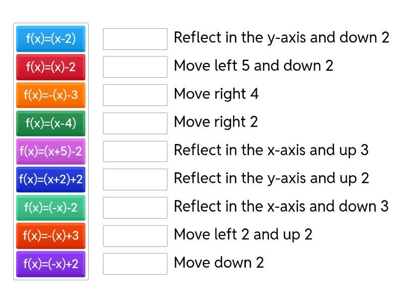f(x)=(x-2) - Move right 2, f(x)=(x+5) - Move left 5, f(x)=(x+8) - Move left 8, f(x)=(x)+3 - Move up 3, f(x)=(x-5)-2 - Move right 5 and down 2, f(x)=(x-5)+2 - Move right 5 and up 2, f(x)=(x+2)+2 - Move left 2 and up 2, f(x)=(x-2)-2 - Move right 2 and down 2, f(x)=(x+5)+2 - Move left 5 and up 2, f(x)=(x+5)-2 - Move left 5 and down 2, f(x)=(x-4) - Move right 4, f(x)=(x)-2 - Move down 2, f(x)=(-x) - Reflect in the y-axis, f(x)=-(x) - Reflect in the x-axis, f(x)=(-x)+2 - Reflect in the y-axis and up 2, f(x)=(-x)-2 - Reflect in the y-axis and down 2, f(x)=-(x)+3 - Reflect in the x-axis and up 3, f(x)=-(x)-3 - Reflect in the x-axis and down 3,