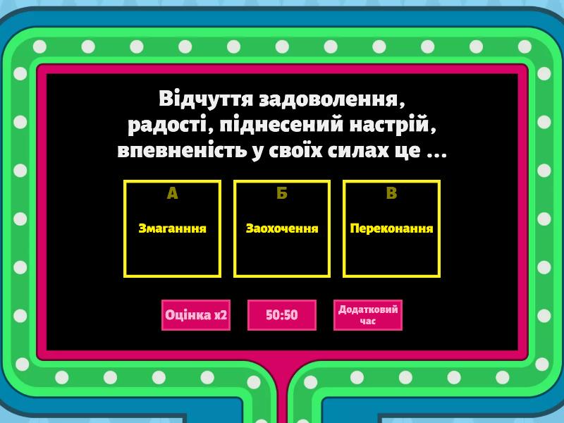 1) Відчуття задоволення, радості, піднесений настрій, впевненість у своїх силах це ... a) Змаганння b) Заохочення c) Переконання 2) Що це за умова заохочення? a) Справедливість b) Опора на громадську думку c) Об'єктивність 3) Похвала щоб мотивувати дитину досягати кращих результатів це умова... a) Оцінка результату і мотивів b) Гласніть заохочення c) Своєчасність заохочення 4) Оберіть картинку яка характеризує вид заохочення: схвалення a) b) c) 5) Продовж думку: спільне між заохоченням і змаганням... a) Мотивація дитини на кращий успіх b) Усвідомлення успішності учня c) Гарний настрій