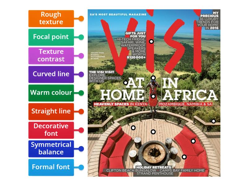 Formal font, Decorative font, Rough texture, Warm colour, Texture contrast, Symmetrical balance, Focal point, Straight line, Curved line.