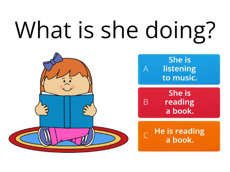 1) What is she doing? a) She is listening to music. b) She is reading a book. c) He is reading a book. 2) What is he doing? a) He is cutting papaer. b) She is cutting paper. c) She is gluing. 3) What is she doing? a) He is listening to music. b) She is listening to music. c) He is writing her name. 4) What is he doing? a) She is counting. b) He is counting. c) I am counting. 5) What is she doing? a) She is writing. b) I am talking. c) She is talking. 6) What is he doing? a) She is writing. b) He is writing. c) I am writing. 7) What is she doing? a) I am gluing. b) She is gluing. c) He is gluing.