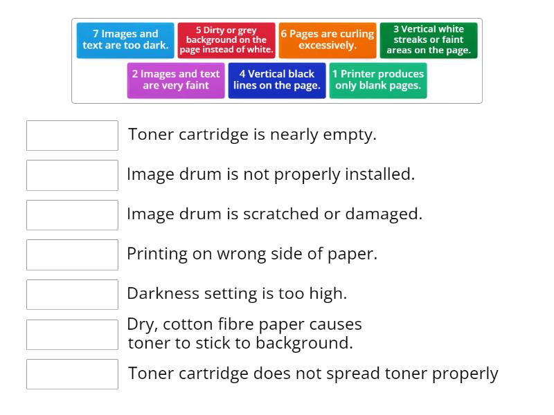 1 Printer produces only blank pages. - Image drum is not properly installed., 2 Images and text are very faint - Toner cartridge is nearly empty., 3 Vertical white streaks or faint areas on the page. - Toner cartridge does not spread toner properly, 4 Vertical black lines on the page. - Image drum is scratched or damaged., 5 Dirty or grey background on the page instead of white. - Dry, cotton fibre paper causes toner to stick to background., 6 Pages are curling excessively. - Printing on wrong side of paper., 7 Images and text are too dark. - Darkness setting is too high.,
