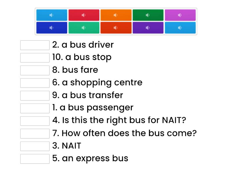 1. a bus passenger, 2. a bus driver, 3. NAIT, 4. Is this the right bus for NAIT?, 5. an express bus, 6. a shopping centre, 7. How often does the bus come?, 8. bus fare, 9. a bus transfer, 10. a bus stop,