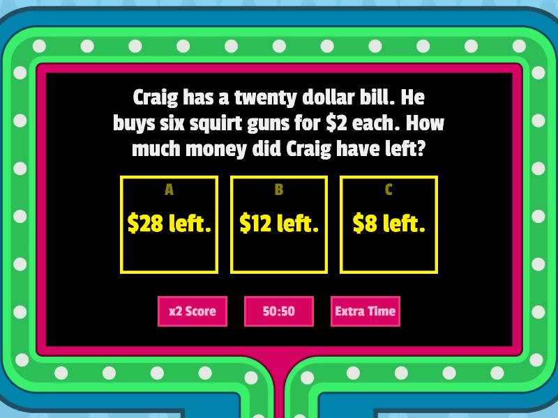 1) Craig has a twenty dollar bill. He buys six squirt guns for $2 each. How much money did Craig have left? a) $28 left. b) $12 left. c) $8 left. 2) There are 8 pink marbles and 1 blue marble in each box.  How many marbles are there in 5 boxes. a) 14 marbles. b) 45 marbles c) 4 marbles.  3) Melissa has 43 gums, but she dropped 11. If she organized the ones she had left into 8 boxes. How many does she put in each box? a) 4 gums b) 9 gums c) 7 gums 4) Pam has 9 bottles of water. She gives 5 to Denise. Sam has 7 times as many as Pam. How many bottles does Sam have? a) 18 bottles. b) 28 bottles c) 10 bottles. 5) A group of students had 49 tickets to play in the fair. They found 7 more on the floor. If they split them evenly among 8 students, how many tickets does each one get? tickets a) 6 tickets b) 7 tickets c) 8 tickets