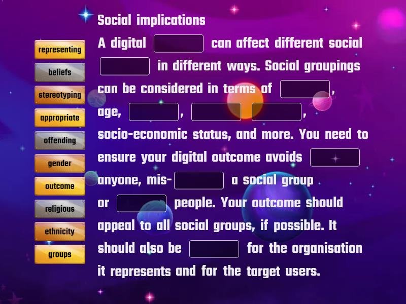 Social implications A digital ____ can affect different social ____ in different ways. Social groupings can be considered in terms of ____, age, ____, ____ ____, socio-economic status, and more. You need to ensure your digital outcome avoids ____ anyone, mis-____ a social group or ____ people. Your outcome should appeal to all social groups, if possible. It should also be ____ for the organisation it represents and for the target users. Cultural Will all cultures be treated fairly by your outcome? If you use other ____, ensure they are used appropriately and use the correct spelling, including macrons for Māori text? If you are using imagery from a minority culture, are you doing so ____? Will your outcome show or say anything that is ____ in some cultures? Obtaining ____ from people of different ____ backgrounds to yourself can provide unexpected insights. Legal Will your outcome obey all relevant ____? These might include the ____ Act, the ____ Act, or ____ laws. For example, make sure your digital outcome doesn’t make ____ allegations, ____ a person’s ethnic origin or sexual orientation, contains no ____ information and contains no ____ that you don’t have ____ to include. Ethical Is it ____? Is it ____? As designers and developers, it’s important that our products don’t cause ____ to anyone. Make sure that your digital outcome doesn’t ____ users, encourage ____ choices, and isn’t ____ or pornographic. Another ethical implication is ensuring that you only claim your original work as your own, crediting the owner or author of any other content. Privacy As digital designers, we often have access to other people’s ____, images or personal information. There are strict laws governing the storage and use of personal information in NZ. Think about how you will keep other people’s personal information ____ and ____. For example, if you are using images of other people in your website, do you have their permission? If your database contains private addresses, are these kept hidden from other users? Accessibility When we make a digital outcome we should ensure most users can access it. This includes people who need to use different screen-sizes or devices, people with ____ or ____, and any other group in our community that may have ____ needs. "The UN Convention on the Rights of ____, which New Zealand has ratified states that we must recognise 'the importance of accessibility to the ____, ____, ____ and cultural environment, to health and education and to information and communication, in enabling persons with disabilities to fully enjoy all human rights and fundamental freedoms." (Be. Accessible) Usability While designing your digital outcome you will think about what your users need ____ and how to help them do this. For example you may consider how the user inputs text into a text box and whether you can make this ____ for them using ____ and a large, visible input box. In year 11 you may have learned about human-computer interaction(HCI) and usability heuristics. These are ideas and ‘____’ you can follow to make the use of your outcome easier for users. Functionality You will need to think about how well your outcome will do what it is supposed to do, and what you can do to ensure that it ____ as intended. This could include how ____ a website loads, whether there are bugs in your code, or whether your outcome ____ on all devices. It’s good to think about specific things when you are investigating the functionality of your digital outcome. For example, rather than just deciding it functions well, you can be more specific and say that the links ____, or the error messages ____ the ____ clearly and ask the user to try again, or the database query displays the correct results, or that the images are ____ and in proportion. Aesthetics Aesthetics is all about the ____ and ____ of your outcome. When you design a digital outcome, it helps to be aware of ____ for the type of product you are making and what you can do to ensure that it appeals to your target audience. It is good if you can recognise and explain what it is that makes an item attractive. You may be able to conduct ____ among your target audience to gather ____ about how you can create an aesthetically ____ product. You may want to meet aesthetic requirements by using a harmonious ____ scheme, designing balanced ____, and using a particular font to support the ____ of your product. Sustainability and future proofing Isn’t it annoying when we need to buy a new phone because the old one won’t ____ the latest and coolest apps? It’s not much use designing items that are no longer usable a year later (although manufacturers and shopkeepers might disagree!). It’s important to design products that can be kept up to ____. If your outcome is software, you should arrange the code in such a way that changes and ____ can easily be made by other programmers later on. Code comments will help other developers understand and edit your code in the future. If it’s a website you might want to set your menu up in such as way that you can easily add pages later on. Using current coding languages and conventions is another way of ____ your outcome. End-user considerations The most beautiful outcome in the world is no use if it doesn’t meet its ____ because your users find it ____ to use! Think about how to ensure that your outcome does what the ____. For example will it use language at a suitable reading level for your users? Will it appeal to the right ____? Will it be available on the devices that your target audience uses? Will it be easy for users to ____? Health and safety Think about how you can make sure your outcome will be free from anything that could potentially ____ your users. For example, a 3D-printed item with small parts that could come loose is not safe around babies. A website should be free from any text that encourages users to do anything ____ or ____. Mental health is an important aspect of health