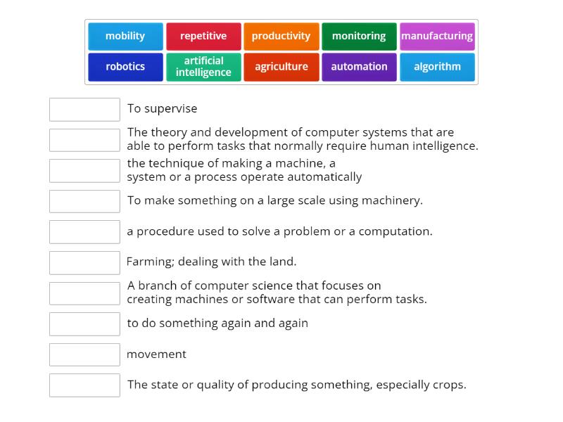 automation - the technique of making a machine, a system or a process operate automatically, algorithm - a procedure used to solve a problem or a computation., artificial intelligence - The theory and development of computer systems that are able to perform tasks that normally require human intelligence., robotics - A branch of computer science that focuses on creating machines or software that can perform tasks., agriculture - Farming; dealing with the land., manufacturing - To make something on a large scale using machinery., repetitive - to do something again and again, mobility - movement, productivity - The state or quality of producing something, especially crops., monitoring - To supervise,