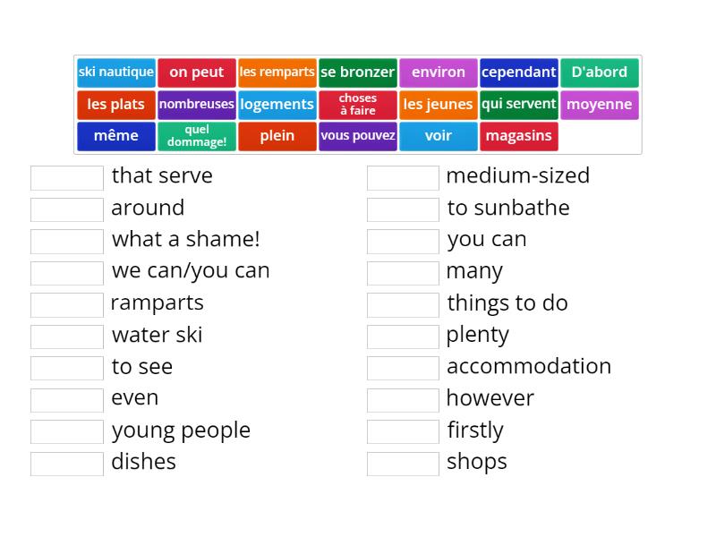 plein - plenty, choses à faire - things to do, vous pouvez - you can, les remparts - ramparts, les plats - dishes, les jeunes - young people, qui servent - that serve, on peut - we can/you can, ski nautique - water ski, se bronzer - to sunbathe, logements - accommodation, moyenne - medium-sized, environ - around, voir - to see, D'abord - firstly, magasins - shops, cependant - however, quel dommage! - what a shame!, nombreuses - many, même - even,