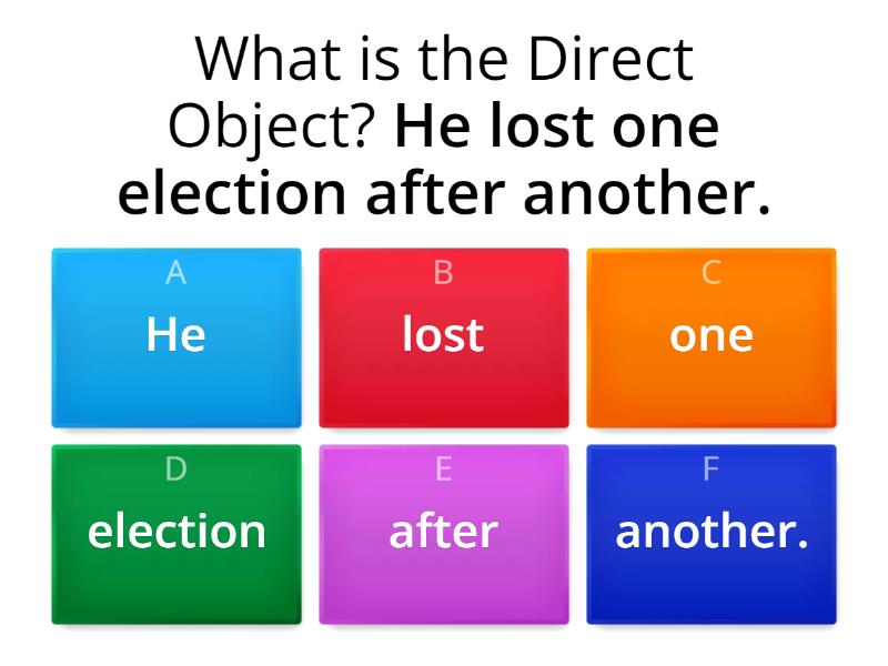 1) What is the Direct Object? He lost one election after another. a) He b) lost c) one d) election e) after f) another. 2) What is the Subject? He lost one election after another. a) He b) lost c) one d) election e) after f) another. 3) What is the Verb (Simple Predicate)? He lost one election after another. a) He b) lost c) one d) election e) after f) another. 4) What is the Verb (Simple Predicate)? Harry bought himself a new suit. a) Harry b) bought c) himself d) a e) new f) suit. 5) What is the Subject? Harry bought himself a new suit. a) Harry b) bought c) himself d) a e) new f) suit. 6) What is the Indirect Object? Harry bought himself a new suit. a) Harry b) bought c) himself d) a e) new f) suit. 7) What is the Direct Object? Harry bought himself a new suit. a) Harry b) bought c) himself d) a e) new f) suit. 8) What is the Direct Object? Valeria bought her mother a carnation. a) Valeria b) bought c) her d) mother e) a f) carnation. 9) What is the indirect Object? Valeria bought her mother a carnation. a) Valeria b) bought c) her d) mother e) a f) carnation. 10) True or False: The following sentence has an indirect object. The policeman arrested the old lady for smoking marijuana. a) True b) False