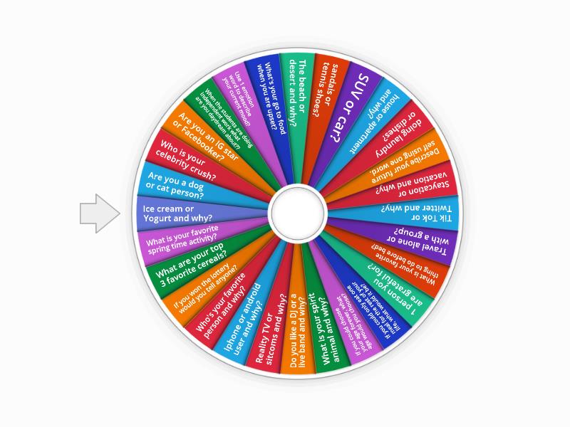Are you a dog or cat person?, Who is your celebrity crush? , Are you an IG star or Facebooker? , When the students are doing Independent work what are you daydream about??, Use 1 emotion word to describe your current mood? , What's your go to food when you are upset? , The beach or desert and why?, sandals or tennis shoes?, SUV or car?, house or apartment and why?, doing laundry or dishes?, Describe your future self using one word., Staycation or vacation and why?, Tik Tok or Twitter and why? , Travel alone or with a group?, What is your favorite thing to do before bed? , 1 person you are grateful for? , If you could only eat one meal for the rest of your life, what would it be? , If you could choose your age forever, what age would you choose?, What is your spirit animal and why? , Do you like a DJ or a live band and why? , Reality TV or sitcoms and why? , Iphone or android user and why?, Who's your favorite person and why? , If you won the lottery would you tell anyone? , What are your top 3 favorite cereals?, What is your favorite spring time activity?, Ice cream or Yogurt and why? .