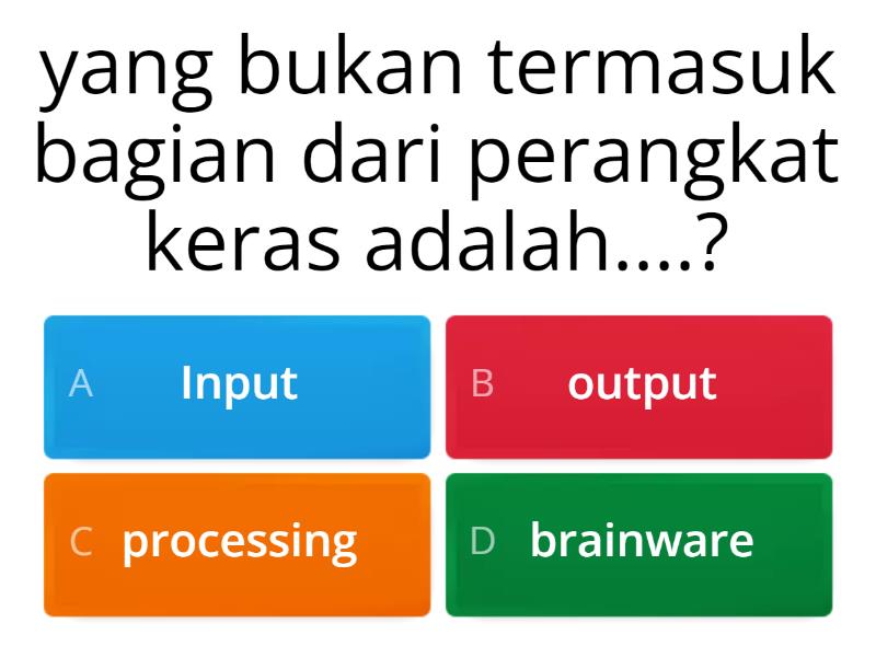 1) yang bukan termasuk bagian dari perangkat keras adalah....? a) Input b) output c) processing d) brainware 2) nama lain dari perangkat keras adalah....? a) Software b) Hardware c) brainware d) storage 3) Yang termasuk perangkat bagian masukan (input) yaitu... a) software b) Keyboard c) chrome d) handphone 4) yang termasuk perangkat lunak adalah... a) Microsoft word b) keyboard c) mouse d) monitor