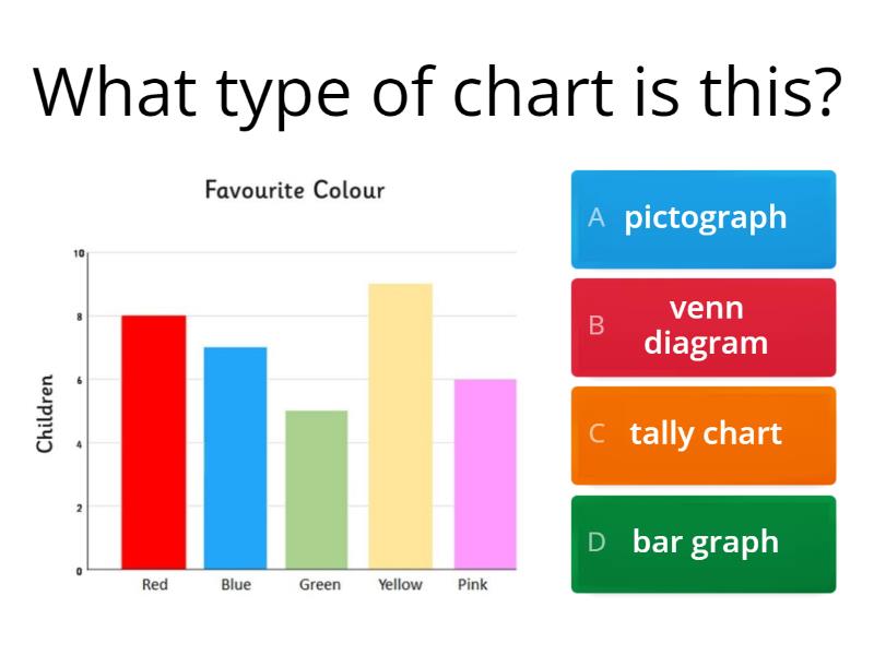 1) What type of chart is this? a) pictograph b) venn diagram c) tally chart d) bar graph 2) What is the title of the bar graph? a) favourite sports b) favourite food c) favourite colour d) favourite drink 3) Which color is liked the most? a) red  b) pink c) yellow d) blue 4) Which is the least favourite colour? a) pink b) green c) red d) yellow 5) How many people liked red? a) 8 b) 5 c) 2 d) 4 6) How many people liked pink? a) 9 b) 6 c) 2 d) 4 7) How many more people like blue than pink? a) 3 b) 1 c) 5 d) 9 8) How many more people like yellow than green? a) 9 b) 7 c) 4 d) 2 9) Do people more like pink or green? a) pink b) green 10) How many people like red and green altogether? a) 10 b) 15 c) 13 d) 14 11) How many people like blue and yellow altogether? a) 18 b) 20 c) 22 d) 16 12) How many people like red and pink altogether? a) 20 b) 17 c) 15 d) 19