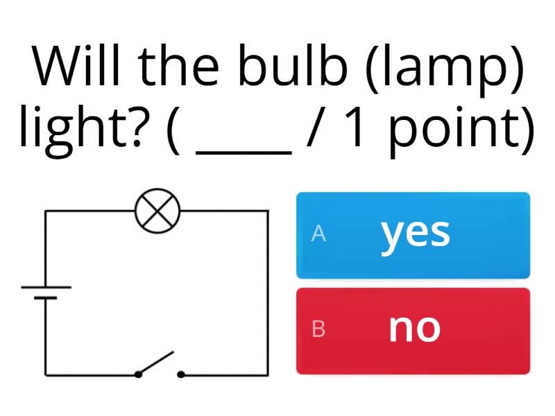 1) Will the bulb (lamp) light? ( ____ / 1 point) a) yes b) no 2) Will the bulb (lamp) light? ( ____ / 1 point) a) yes b) no 3) Will the bulb light and the buzzer make a sound? ( ____ / 1 point) a) yes b) no