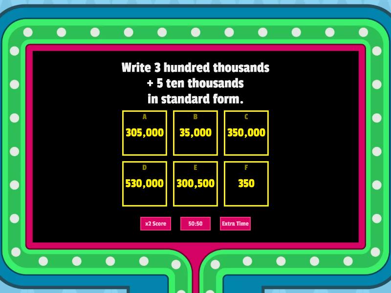 1) Write 3 hundred thousands + 5 ten thousands in standard form. a) 305,000 b) 35,000 c) 350,000 d) 530,000 e) 300,500 f) 350 2) Write 3000 + 30 in standard form. a) 3,300 b) 30,030 c) 3,033 d) 3,030 e) 300,030 f) 33,000