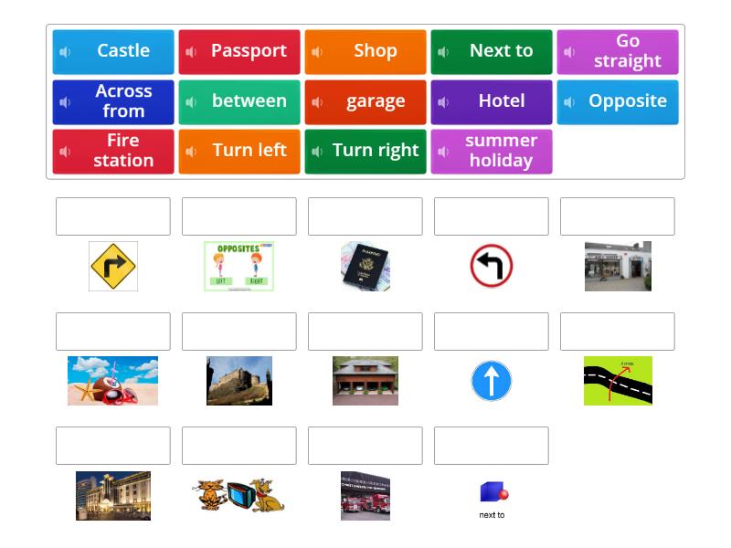 garage , Turn right, Turn left, Go straight , Passport, Castle, Shop, Opposite , Across from, Next to , between , Hotel, summer holiday , Fire station ,