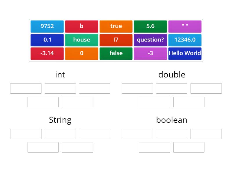 int: I7, -3, 0, 9752, double: 0.1, -3.14, 5.6, 12346.0, String: house, Hello World, b, " ", question?, boolean: true, false,