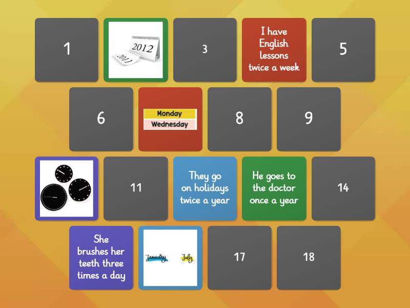 He goes to the doctor once a year, She brushes her teeth three times a day, I have English lessons twice a week, They go on holidays twice a year, My mum never drives a car, My dad plays tennis once a week, He visits his grandparents once a month, She goes shopping three time a week, I watch TV once a day.,