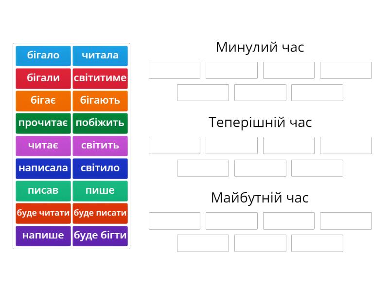 Минулий час: читала, писав, написала, бігали, бігало, світило, Теперішній час: читає, пише, бігає, бігають, світить, Майбутній час: прочитає, буде читати, напише, буде писати, побіжить, буде бігти, світитиме,