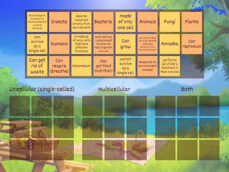 Unicellular (single-celled): made of only one cell, can survive as a single cell, performs all of life's functions in that one cell, absorbs materials directly from environment, Amoeba, Bacteria, Paramecium, Fungi, Multicellular: is made up of many cells that have different functions, cannot survive as a single cell, each cell has a specialized function to help organism survive, has transport systems to move materials around the body, only the surface cells can absorb materials directly from the environment , Humans, Plants, Animals, Insects, Both: Can reproduce, Can get rid of waste, Can respire (breathe), Responds to environment (moves), Can get food (nutrition), Can grow ,