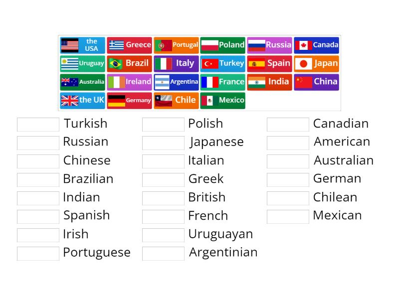 Argentina - Argentinian, Australia - Australian, Brazil - Brazilian, Canada - Canadian, Chile - Chilean, China - Chinese, France - French, Germany - German, Greece - Greek, India - Indian, Ireland - Irish, Italy - Italian, Japan - Japanese, Mexico - Mexican, Poland - Polish, Portugal - Portuguese, Russia - Russian, Spain - Spanish, Turkey - Turkish, the UK - British, the USA - American, Uruguay - Uruguayan,