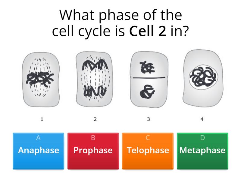 1) Which model accurately shows a cell progressing through mitosis? a) A b) B c) C d) D 2) Which table best compares the events that occur during different stages of the cell cycle? a) b) c) d) 3) The synthesis of DNA happens during - a) G1 phase b) G2 phase c) M phase d) S phase 4) DNA replication happens during - a) S phase b) G1 phase c) G2 phase d) M phase 5) Replication means - a) to delete b) to rotate c) to make a change d) to make a copy 6) The synthesis of DNA happens during - a) G2 Phase b) G1 phase c) S phase d) M phase 7) The cell is growing and carrying out processes such as metabolism and DNA replication. a) Interphase b) R phase c) M phase d) Q phase 8) During interphase a cell is - a) The cell is growing and carrying out processes such as DNA replication b) Dividing in to two new cells c) Pulling apart chromosomes d) Reproducing itself 9) Which cell shows spindle fibers separating chromosomes? a) 1 b) 2 c) 3 d) 4 10) What phase of the cell cycle is Cell 1 in? a) Prophase b) Metaphase c) Telophase d) Anaphase 11) What phase of the cell cycle is Cell 2 in? a) Prophase b) Metaphase c) Telophase d) Anaphase 12) Which cell shows chromosomes lining up in the middle of the cell? a) 4 b) 2 c) 3 d) 1 13) The major purpose of mitosis is for - a) making children b) creating new bacteria c) cellular respiration d) growth and repair 14) During S phase, the amount of DNA in the nucleus a) stays the same b) doubles c) triples d) gets cut in half 15) What happens during M phase? a) DNA replication b) Cellular respiration c) photosynthesis d) Nuclear division 16) What happens during M phase? a) DNA replication b) Cellular respiration c) Division of the ATP d) Division of the nucleus 17) Which lists the three parts of interphase in the correct order? a) G1, G2, S b) S, G1, G2 c) G1, S, G2 d) S, G2, G1 18) Arrow 1 is - a) M Phase b) R Phase c) Interphase d) Telophase 19) Arrow 2 is - a) Anaphase b) M Phase c) Interphase d) Telophase 20) What three phases are part of Arrow 1 - a) G1 b) Anaphase c) S d) M e) G2 f) Telophase 21) Synthesis means - a) to make b) to delete c) to hide d) to reduce 22) The phase of the cell cycle that includes mitosis and cytokinesis. a) M phase b) Interphase c) S phase 23) What is the correct order for steps of the cell cycle? a) B, D, C, F, E, A b) A, D, C, F, E, B c) A, B, C, F, D, E d) A, E, F, C, D, B 24) Mitosis produces - SELECT ALL THAT APPLY a) genetically identical cells b) genetically unique cells c) 2 new cells d) 4 new cells