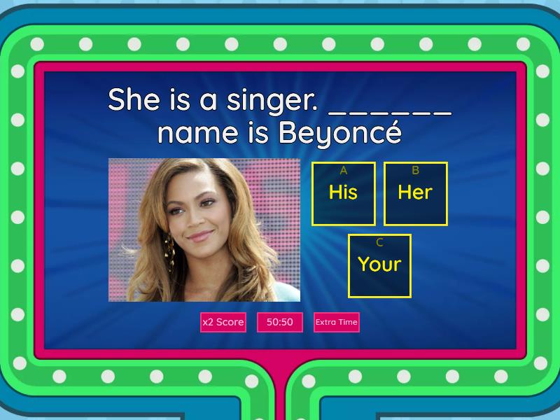 1) She is a singer. ______ name is Beyoncé a) His b) Her c) Your 2) They are friends. ________ names are Phoebe, Monica and Rachel a) Her b) Your c) Their 3) This is my favorite series. ______ name is The Office. a) His b) Your c) Its 4) They are classmates. ______ names are Cady and Regina George. a) Their b) His c) Her 5) She is a Mexican painter. ______ name is Frida Kahlo.  a) His b) Your c) Her 6) They are from England. ______ nationality is English. a) Their b) His c) Her d) Its 7) The cups are on the table. ______ colors are purple, green, yellow and orange. a) Its b) Their c) Our d) His 8) She's an actress ______ name's Jennifer Aniston  a) His b) Her c) Your 9) We are English students. ______ classes are on Fridays a) My b) Its c) Our 10) He's an actor. _____ name is Ryan Gosling a) Her b) His c) Their