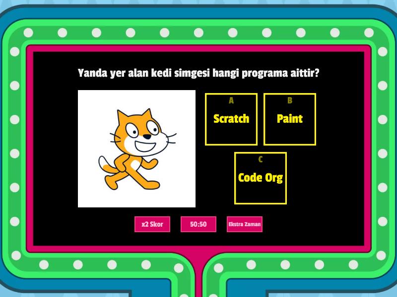 1) Yanda yer alan kedi simgesi hangi programa aittir? a) Scratch b) Paint c) Code Org 2) Kedinin sürekli miyav söylemesi için aşağıdakilerden hangisine ihtiyacı yoktur? a) b) c) 3) Kedinin ekranın kenarına geldiğinde geri dönmesi için hangi komut kullanılmalıdır? a) b) c) 4) Aşağıdakilerden hangisi ile kukla hareket edebilir? a) b) c) 5) Kuklanın 20 adım gitmesi için hangi komut kullanılmalıdır? a) b) c) 6) Aşağıdakilerden hangisi ile Scratch uygulamasında kukla seçme işlemini yaparız? a) b) c) 7) Aşağıdakilerden hangisi ile Scratch uygulamasında sahne seçme işlemini yaparız? a) b) c) 8) Yanda yer alan simgelerin görevi nedir? a) Kaydet - Sil b) Başlat - Kaydet c) Başlat - Durdur 9) Yandaki kod bloğunun görevi nedir? a) Karakter 10 adım ilerler. b) Karakter 50 adım ilerler. c) Karakter 5 adım ilerler.