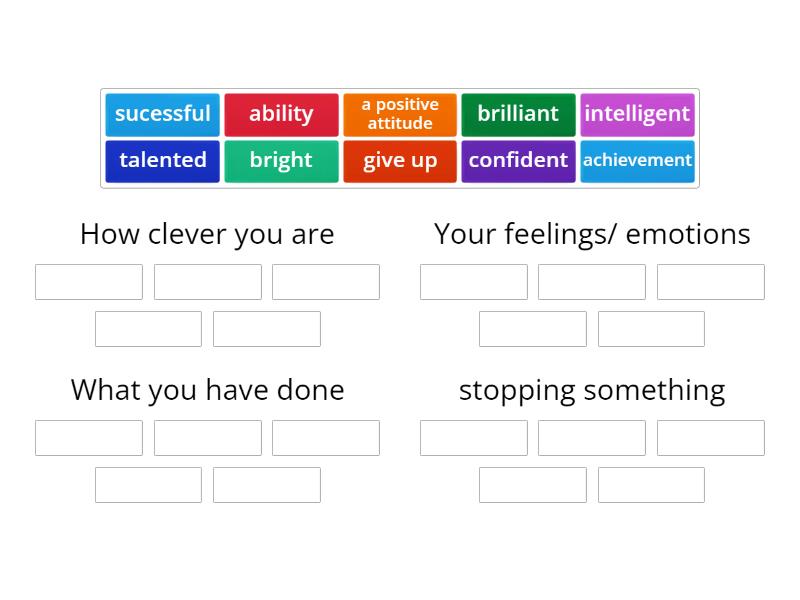 How clever you are: talented, brilliant, bright, intelligent, ability, Your feelings/ emotions: confident, a positive attitude, What you have done: sucessful, achievement, stopping something: give up ,