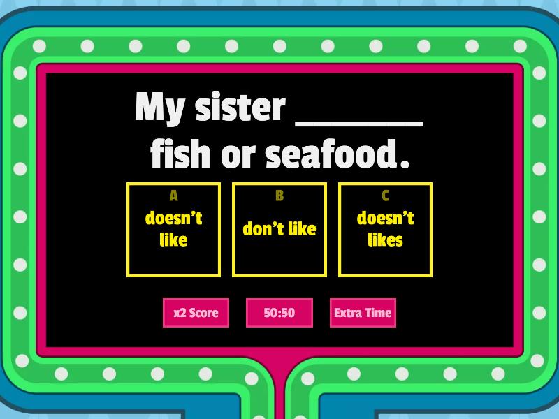 1) My sister _______ fish or seafood. a) doesn't like b) don't like c) doesn't likes 2) I have a quick breakfast because _______ in a hurry. a) I usually b) usually am c) I'm usually 3) I _________ TV when I'm having a meal. a) never watch b) don't never watch c) am never watching 4) I usually drink a lot of diet Coke, but at the moment _________ to cut down. a) I try b) I'm trying c) I'm triing 5) ___________ any brothers or sisters? a) Are you having b) Are you have c) Do you have 6) What _____ when you leave school? a) you are going to do b) are you going do c) are you going to do 7) I can't see you this evening because ________ some friends. a) I'm meeting b) I meet c) I'll meet 8) A: Would you like something to drink? B: Yes, ___________ an orange juice, please. a) I have b) I'm having c) I'll have 9) A: I can't open this jar. B: ________ help you? a) Shall I b) Will I c) Do I 10) That's a lovely dress. Where ______ it? a) have you bought b) did you buy c) did you bought 11) __________ good at saving money. a) I've never been b) I haven't never been c) I've never 12) I got $50 for my birthday, but I _______. a) didn't spend it yet b) haven't spent it yet c) yet I haven't spent it. 13) I've had this computer _____ . a) for about three years b) since about three years c) for about 3 years ago 14) A: How long _________ in Paris? B: Since last March. a) is he living b) has he living c) has he been living 15) ___________ the same gym for five years. a) I'm going to b) I've been going to c) I go to 16) Which word is different? a) prawns b) mussels c) duck d) squid 17) Which word is different? a) lamb b) crab c) beef d) pork 18) Which word is different? a) cherry b) pear c) peach d) beetroot 19) Which word is different? a) raspberry b) cucumber c) pepper d) cabbage 20) Which word is different? a) fried b) baked c) chicken d) roast 21) Which prefix makes the opposite of 'honest' a) in b) un c) dis 22) Shall we eat _____ tonight? I don't feel like cooking. a) out b) on c) back d) down 23) We live ____ my salary. My wife is unemployed. a) out b) on c) back d) down 24) I'm allergic to milk, so I have to cut _______ dairy products from my diet. a) out b) on c) back d) down 25) I'll _______ you the money if you promise to pay me back. a) borrow b) lend 26) I took $200 _____ of my bank account. a) out b) on c) back d) down 27) Have you ever wasted money ____ something that you've never used? a) out b) on c) of d) in 28) The money he earns isn't enough to live ____. He'll have to get a second job a) out b) to c) off d) on 29) He got ____ debt when he lost his job. a) by b) in c) to d) into
