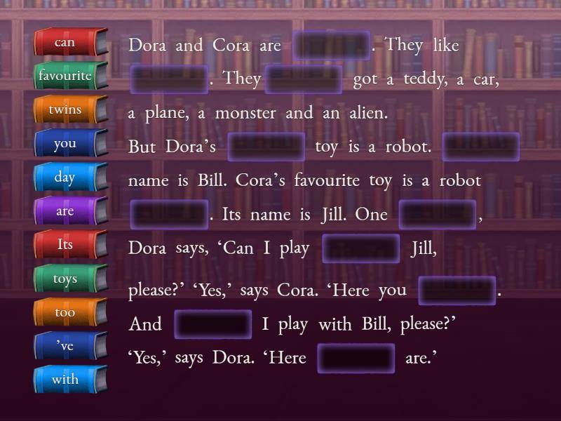 Dora and Cora are ____. They like ____. They____ got a teddy, a car, a plane, a monster and an alien. But Dora’s ____ toy is a robot. ____ name is Bill. Cora’s favourite toy is a robot ____. Its name is Jill. One ____, Dora says, ‘Can I play ____ Jill, please?’ ‘Yes,’ says Cora. ‘Here you ____. And ____ I play with Bill, please?’ ‘Yes,’ says Dora. ‘Here ____ are.’ Dora and Cora like ____ new robots. The twins are ____ happy. 'Jill is my robot,’ says Dora. ‘No, she ____!’ says Cora. Jill’s my robot!’ ‘Bill is my robot,’ says Cora. ‘No, he isn’t!’ says Dora. ‘Bill’s my robot!’ Oh, no! The twins are very ____ now. ‘____ I have Bill, ____, Cora?’ says Dora. ‘OK,’ says Cora. ‘Here you are. I’m sorry, Dora.’ ‘Can I have Jill, please, Dora?’ says Cora. ‘OK,’ ____ Dora. ‘Here you are. I’m sorry, Cora.’ The twins are happy again.