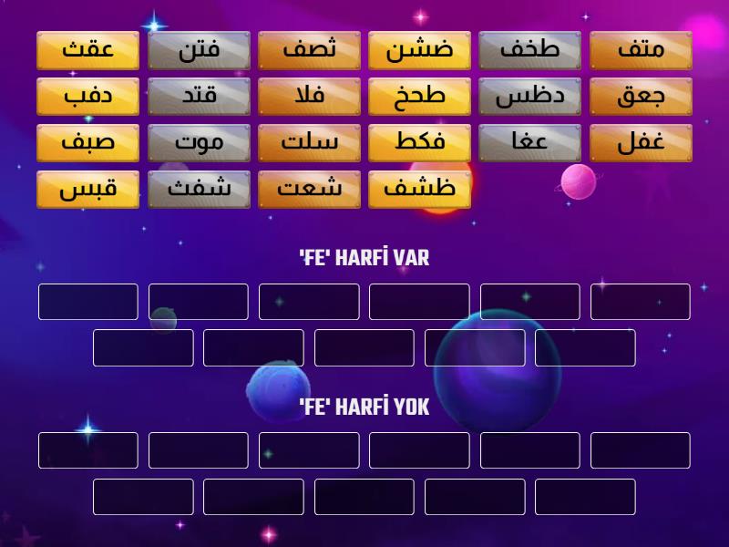 'FE' HARFİ VAR : فلا , فكط , دفب , غفل , شفث , صبف , ظشف , ثصف, متف , طخف, فتن, 'FE' HARFİ YOK: طحخ , عغا , عقث, قبس, شعت, موت, دظس , ضشن , جعق, قتد , سلت,