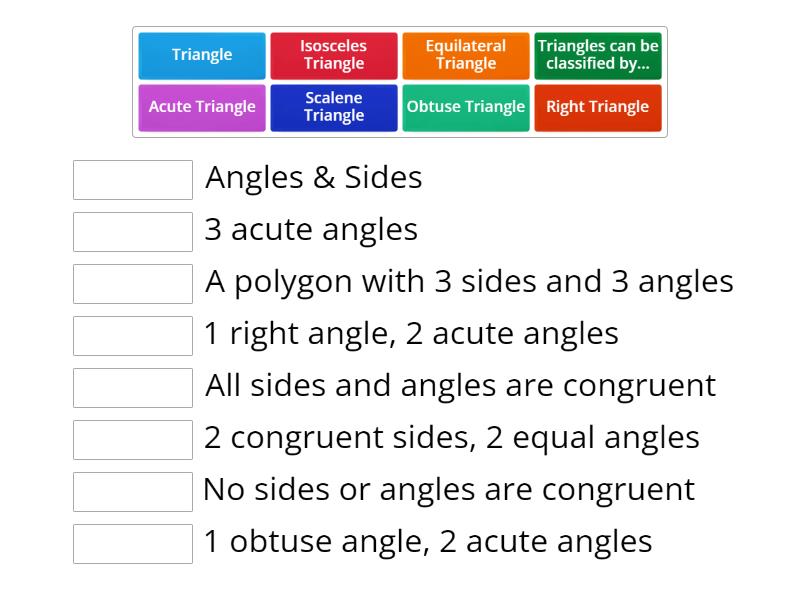 Acute Triangle - 3 acute angles, Right Triangle - 1 right angle, 2 acute angles, Obtuse Triangle - 1 obtuse angle, 2 acute angles, Scalene Triangle - No sides or angles are congruent, Isosceles Triangle - 2 congruent sides, 2 equal angles, Equilateral Triangle - All sides and angles are congruent, Triangles can be classified by... - Angles & Sides, Triangle - A polygon with 3 sides and 3 angles,