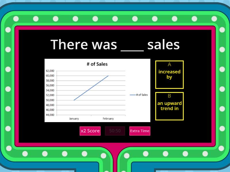 1) There was ____ sales a) increased by b) an upward trend in 2) Sales increased _____ twenty percent. a) by b) of 3) Doobly had a decline ____ 10% ___ market share. a) by ... of b) of ... in 4) PICO's market decreased ____. a) from 5% to 4% b) between 6% and 12 5) This chart shows the change in market share ___ a two-year period. a) in b) to 6) The number of visits _________ dramatically ______ 2011 to 2012 a) decreased ... to b) increased ... from 7) Visits do______ ______ 2011 ______ 2012. a) tripled over...but b) doubled between...and... 8) The number of visits ______ in 2012. a) peaked b) plummeted 9) Visits ______ sharply in 2013. a) rose b) dropped 10) Visits _________ in 2014 and 2015. a) decreased dramatically b) leveled off 11) Thirty-two thousand a) 32,000 b) 23,000 12) Eighteen thousand two hundred fifty a) 18,250 b) 18,502 13) 11/3 a) Eleven third b) Eleven thirds 14) € 239 a) Two hundred thirty-nine euros b) Two hundred thirty-nin euros 15) 0.7 a) seven tenths b) senven point zero 16) One hundred and seventy-five square meters a) 175 m2 b) 157m2 17) 2 million ______ a) dollars b) dollar 18) just under ten million units a) 9.7M b) 10.4M 19) eighty-three thousand seven hundred eighty-nine a) 83,789 b) 83,879 20) 13.8 a) third-teen point eight b) thirds-teen point eight