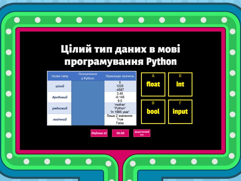 1) Цілий тип даних в мові програмування Python a) float b) int c) bool d) input 2) Дійсний тип даних в мові програмування Python a) int b) bool c) input d) float e) print 3) Текстовий тип даних в мові програмування Python a) int b) float c) str d) input 4) Функція введення даних з клавіатури в мові програмування Python a) int b) print c) input d) bool 5) Функція виведення даних на екран монітору в мові програмування Python a) print b) input c) str d) monitor e) int 6) Якій об'єкт використовують для доповнення зображень готовими малюнками? a) text b) window c) image 7) Який модуль використовують для побудови графічних об’єктів, що складаються з геометричних примітивів і готових малюнків? a) tartle b) tkinter c) float d) int 8) Який модуль використовують для побудови зображень? a) copy b) tkinter c) turtle d) pickle 9) Для створення полотна необхідно ввести a) tkinter.import b) tkinter.Canvas c) tkinter.Canv 10) Якій об'єкт використовують для доповнення зображень текстом? a) text b) window c) image 11) Якого кольору буде намальована лінія в результаті виконання наступної команди? canvas.create_line(x,y,x+a,y, width=4, fill='red') a) зеленого b) жовтого c) червоного d) блакитного 12) Якій напис буде додано до зображення? c.create_text(150, 200, text='Miй малюнок', justify=CENTER, font='Calibri 24', fill='green') a) Малюнок b) Мій малюнок c) сірий d) зелений