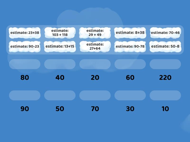 estimate: 90-78 - 10, estimate: 70-46 - 20, estimate: 13+15 - 30, estimate: 27+64 - 90, estimate: 50-8 - 40, estimate: 8+38 - 50, estimate: 90-23 - 70, estimate: 23+38 - 60, estimate: 103 + 118 - 220, estimate: 29 + 49 - 80,