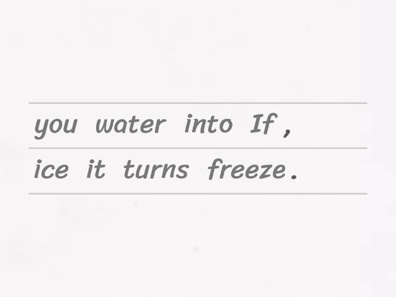 If you freeze water, it turns into ice., If we turn off the AC, it may get very hot in here., If you mix blue and yellow, you get green., If they work together, they could win the game., If you put food in the fridge, it lasts longer., What will you do if it's sunny tomorrow?, Recycle more if we want to help the planet., If there is a thunderstorm, you shouldn't stand under a tree., If babies cry, they might be hungry., If he doesn't change, he might lose her again., If you add salt to the soup, it tastes better., If you eat too much junk food, you might get sick., If he asks for directions, tell him to follow the signs., If she's late, she can call and let us know., If you press the button, the light turns on.,