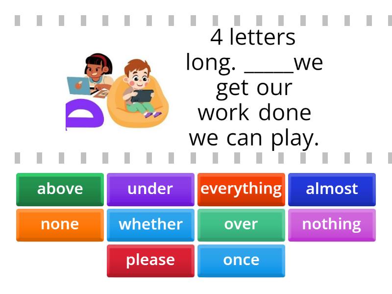 once - 4 letters long. _____we get our work done we can play. , please - 6 letters. Would you _______close your mouth when you eat., none - 4 letters. Sorry, I have _____ of those. , above - 5 letters.  Look ______ the fridge. , nothing - 7 letters. There is _________ in my tummy, almost - 6 letters. I ______caught my phone., over - 4 letters.The cow jumped ______ the moon., everything - 10 letters. I like ________ on my bagel., under - 5 letters.The dog is ______ the table. , whether - 7 letters. I can't decide _______ to go out or stay inside. ,