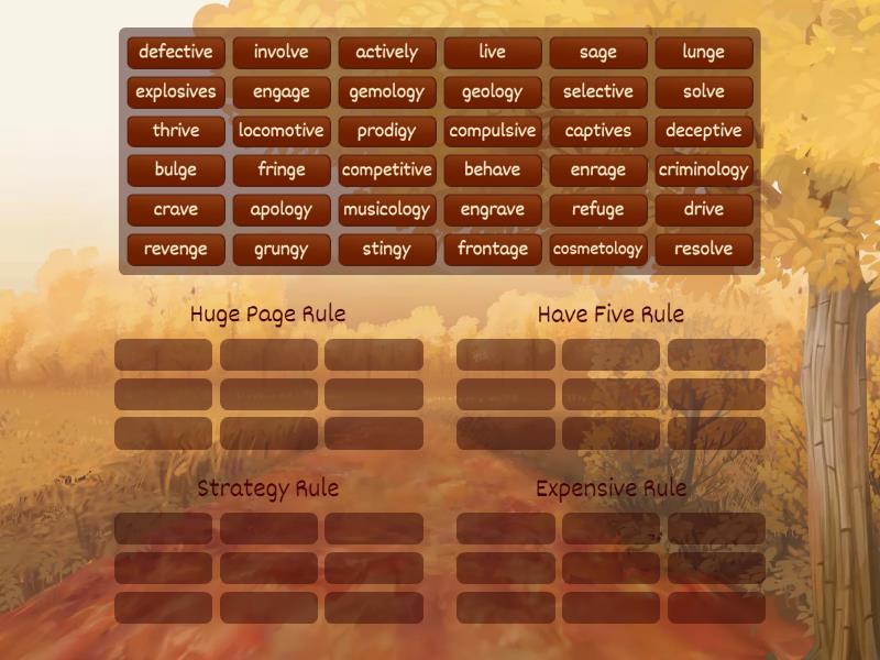 Huge Page Rule: fringe, enrage, refuge, lunge, bulge, revenge, engage, sage, frontage, Have Five Rule: crave, thrive, resolve, solve, engrave, involve, drive, behave, live, Strategy Rule: criminology, prodigy, apology, geology, musicology, gemology, cosmetology, grungy, stingy, Expensive Rule: locomotive, compulsive, defective, actively, selective, deceptive, explosives, captives, competitive,