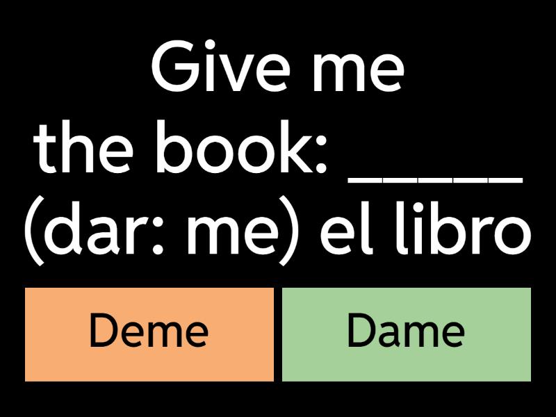 1) Give me the book: _____ (dar: me) el libro a) Deme b) Dame 2) Look at me: ________ (mirar: me) a) mírame b) míreme 3) Call me: _________ (llamar: me) a) llámeme b) llámame 4) Listen to me: ______ (escuchar: me) a) Escúchame b) Escúcheme 5) Lend me a pencil: _______ (prestar: me) un lápiz a) Préstame b) Présteme 6) : _____ (comprar: me) un refresco a) Cómpreme b) Cómprame 7) Order me a soda: ______ (pedir: me) un refresco a) Pídeme b) Pídame 8) Wake me up: ______ (despertar: me) a las ocho a) Despiértame b) Despiérteme 9) Send me a message: ____ (mandar: me) un mensaje a) Mándeme b) Mándame 10) Wake up: _______ (despertarse) a) Despiértate b) Despiértete 11) Go to bed: ________ (acostarse) a) Acuéstate b) Acuéstete 12) Stand up: _______ (levantarse) a) Lévantate b) Levántete 13) Sit down: _____ (sentarse) a) Siéntete b) Siéntate 14) Get dressed: ______ (vestirse) a) Vístete b) Vístate 15) Brush your teeth: ______ (cepillarse) los dientes a) Cepíllate b) Cepíllete 16) Shave your legs: _______ (afeitarse) las piernas a) Aféitete b) Aféitate 17) put on your shirt: _______ (ponerse) una camisa a) Pónete b) Ponte 18) Take off your hat: ______ (quitarse) la gorra a) Quítate b) Quítete 19) Put on make up: _______ (maquillarse) a) Maquíllete b) Maquíllate 20) Take a shower: _______ (ducharse) a) Dúchate b) Dúchete