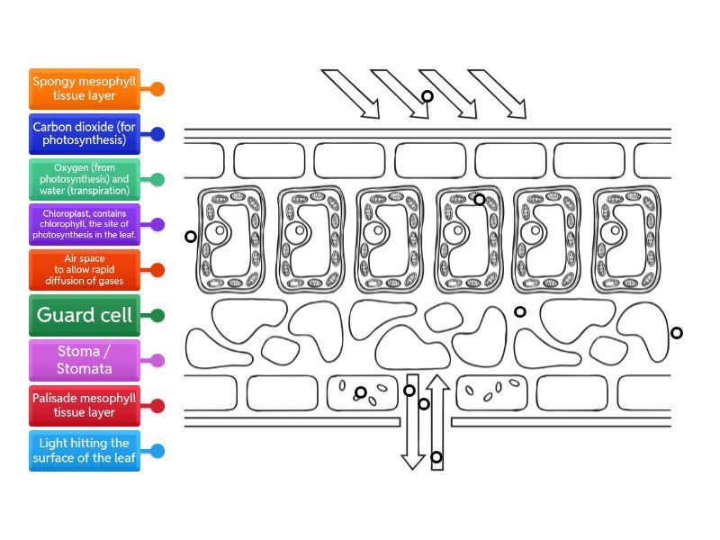 Light hitting the surface of the leaf, Palisade mesophyll tissue layer, Spongy mesophyll tissue layer, Guard cell, Stoma / Stomata, Carbon dioxide (for photosynthesis), Oxygen (from photosynthesis) and water (transpiration), Air space to allow rapid diffusion of gases, Chloroplast, contains chlorophyll, the site of photosynthesis in the leaf..