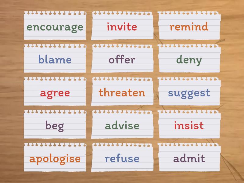 agree - to do, refuse - to do, offer - to do, threaten - to do, advise - smb to do, beg - smb to do, remind - smb of smth, deny - doing, encourage - smb to do, apologise - for doing, insist - on doing, admit - doing, blame - smb for smth, suggest - doing, invite - smb to do,