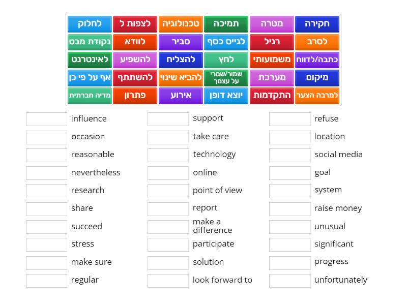 מטרה - goal, להשפיע - influence, מיקום - location, לצפות ל - look forward to, להביא שינוי - make a difference, לוודא - make sure, אף על פי כן - nevertheless, אירוע - occasion, לאינטרנט - online, להשתתף - participate, נקודת מבט - point of view, התקדמות - progress, לגייס כסף - raise money, סביר - reasonable, לסרב - refuse, רגיל - regular, כתבה/לדווח - report, חקירה - research, משמועותי - significant, לחלוק - share, מדיה חברתית - social media, פתרון - solution, לחץ - stress, להצליח - succeed, תמיכה - support, מערכת - system, שמור/שמרי על עצמך - take care, טכנולוגיה - technology, למרבה הצער - unfortunately, יוצא דופן - unusual,