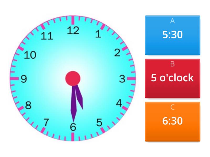 1) How many minutes in an hour? a) 30 b) 60 c) 15 2) How many minutes in half an hour? a) 15 b) 30 c) 20 3) Which is the shortest hand on a clock? a) hour b) minute 4) Which is the longest hand on a clock? a) hour b) minute 5) What is the difference between AM and PM? a) am is from lunch to noon. pm is from noon to midnight. b) am is from midnight to lunch. pm is from lunch to midnight c) am is at night and pm is party time. d) am is when it's dark and pm is when it's light.